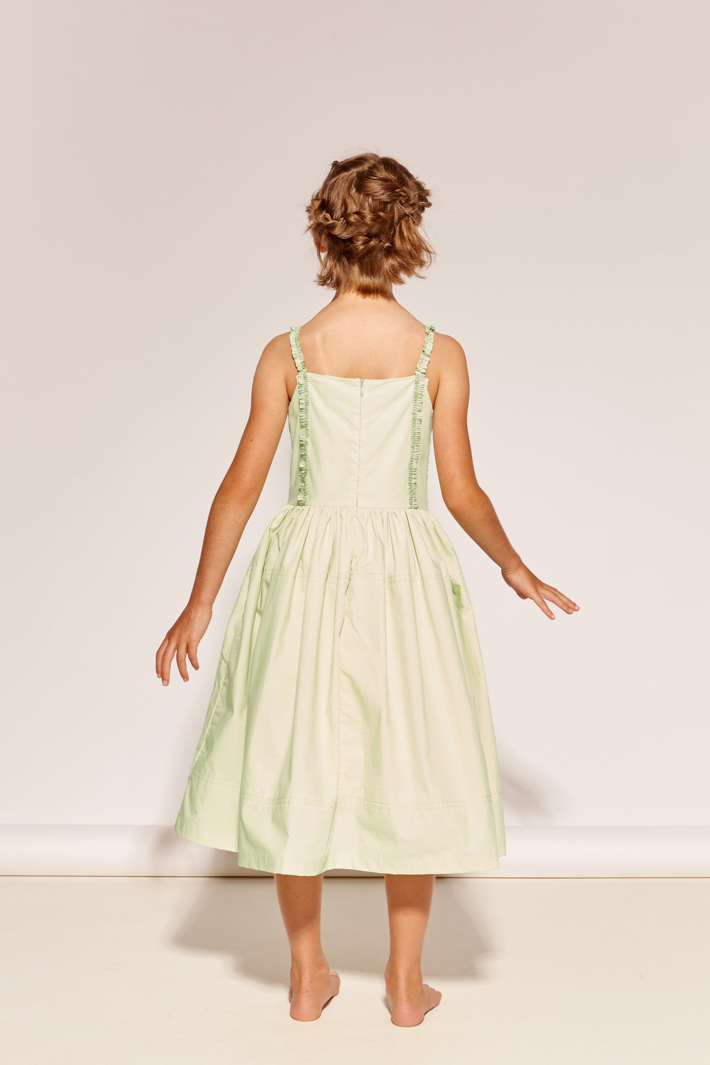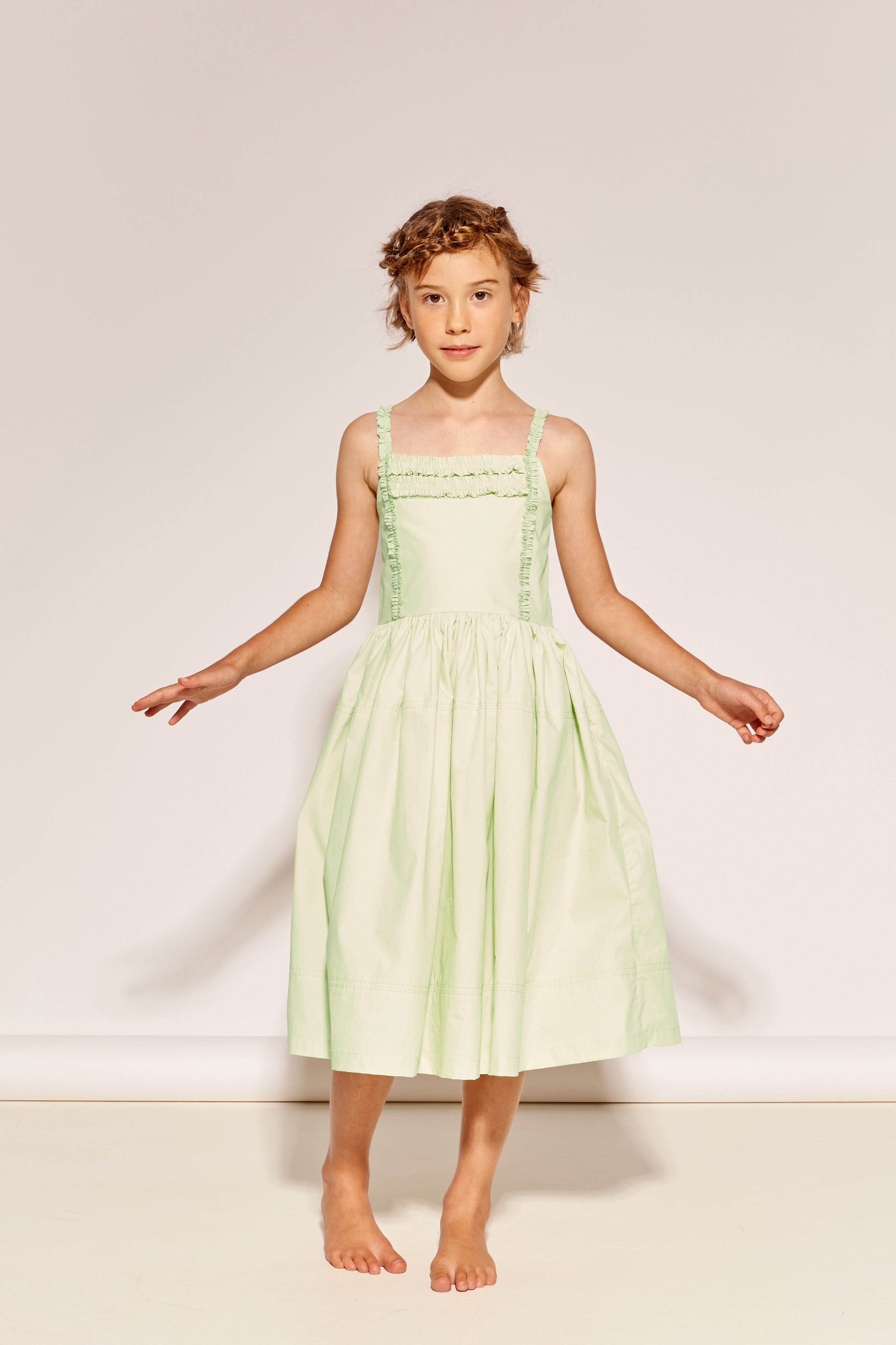 Cotton poplin dress with ruched straps & chest detailing featuring contrast stitching to skirt. Lined with concealed zip to centre back.