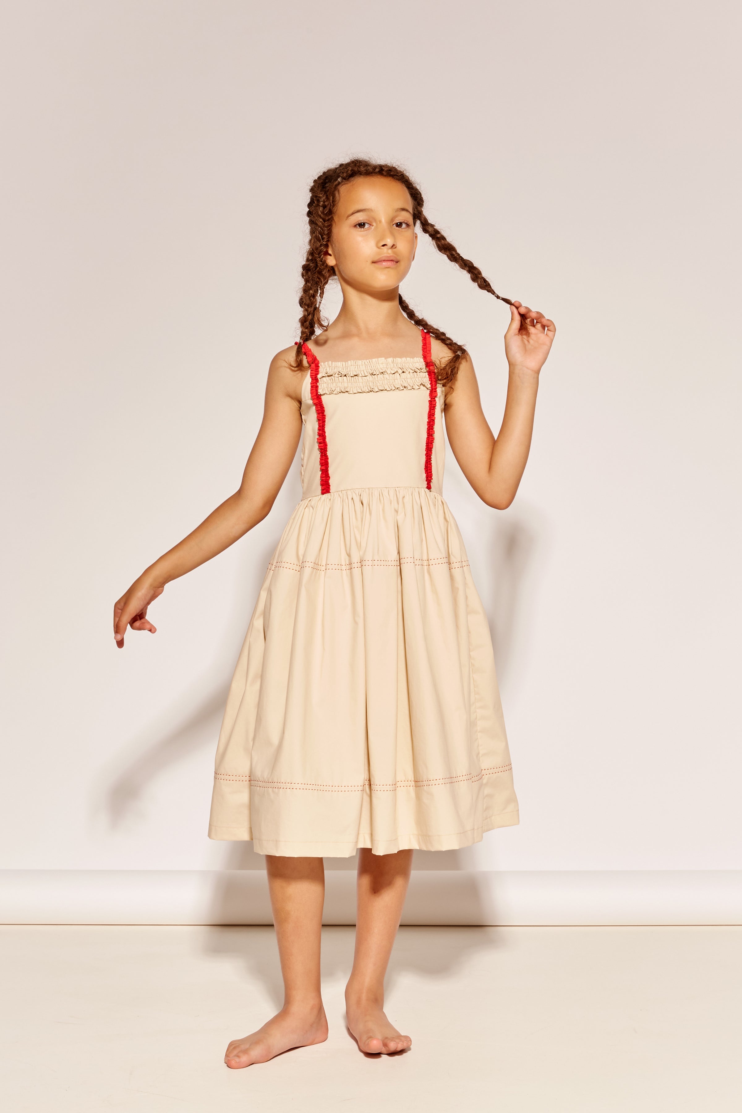 Cotton poplin dress with ruched straps & chest detailing featuring contrast stitching to skirt. Lined with concealed zip to centre back.