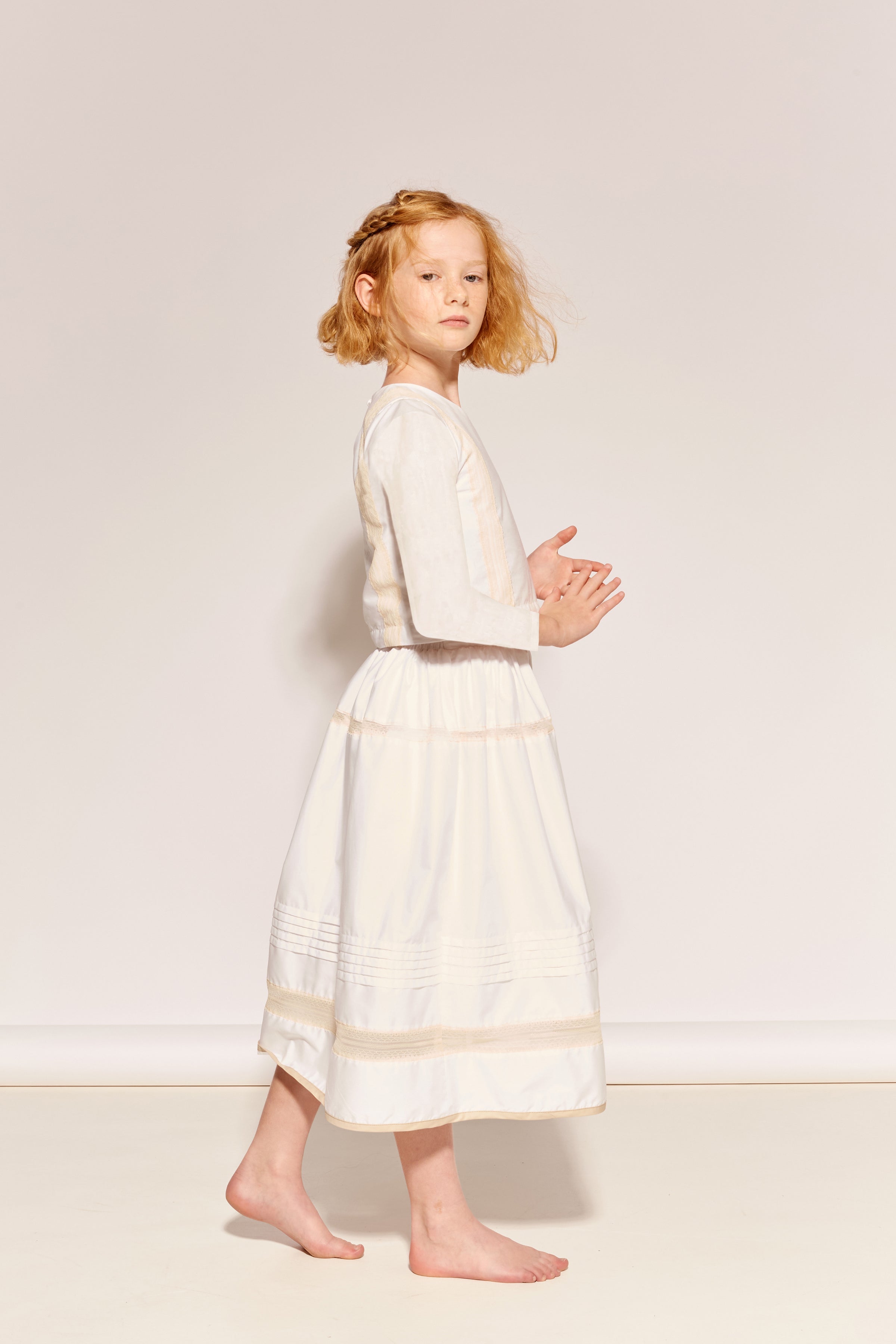 Light cotton sateen top with vertical contrast lace. 3/4 sleeves and key-hole back opening. Lined.