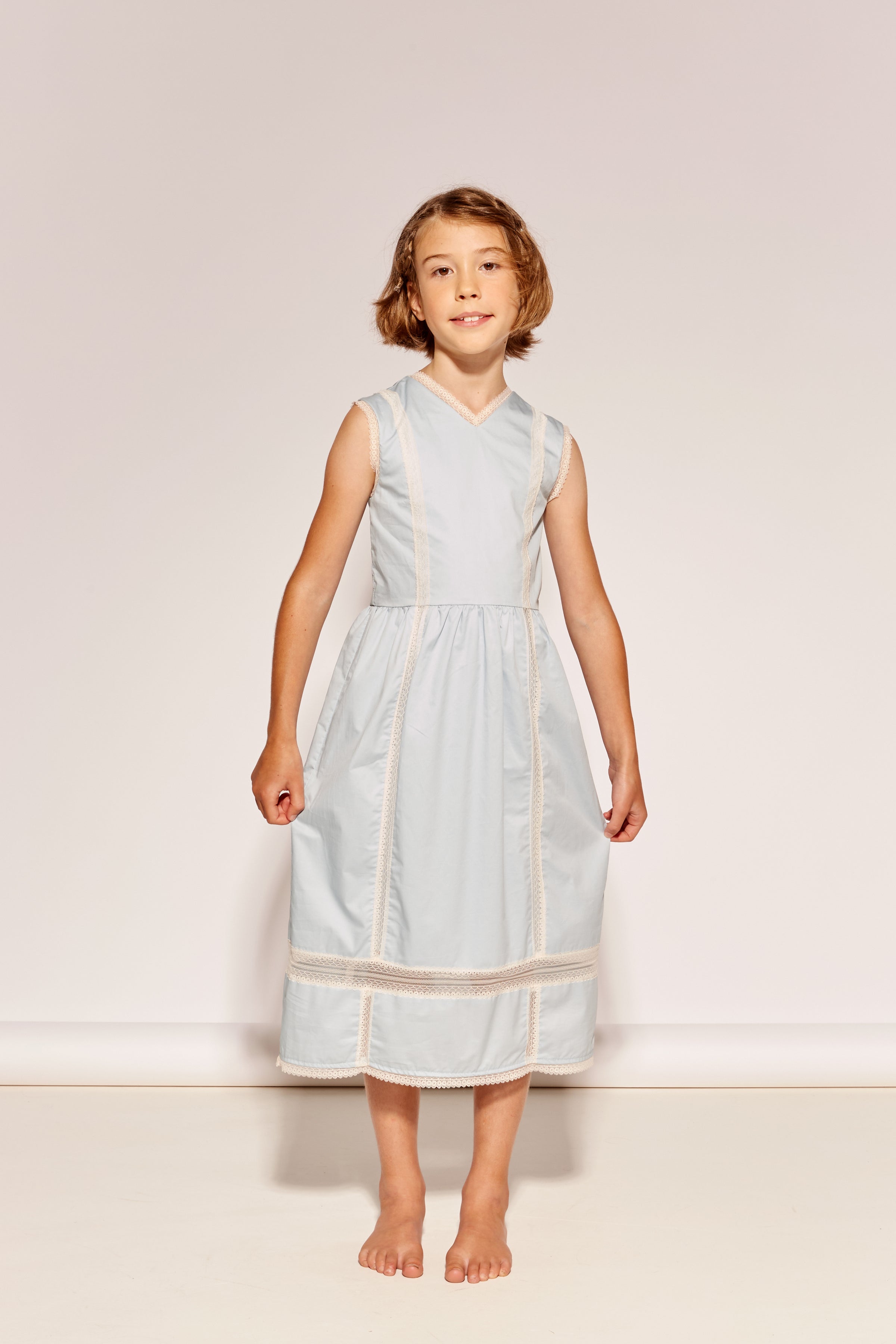 Cotton poplin V neck dress with delicate contrast lace detailing. Lined with concealed zip to centre back.